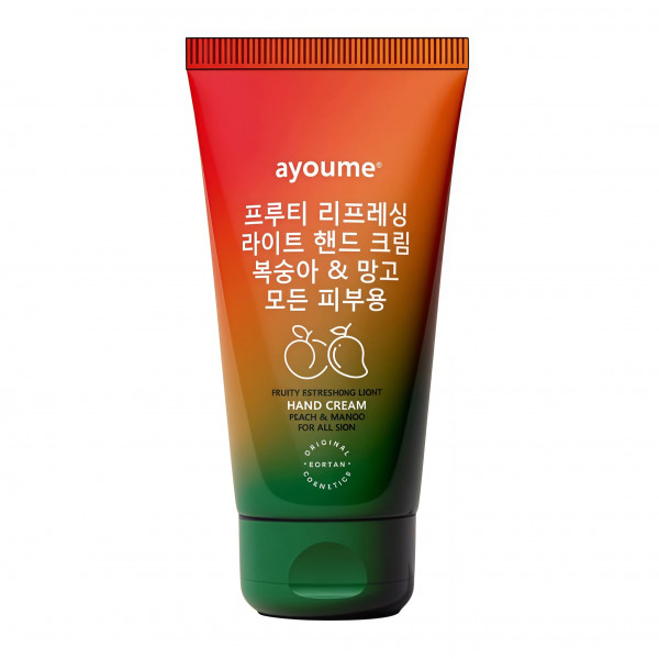 Освежающий крем для рук с экстрактами персика и манго Ayoume Fruity Refreshing Light Hand Cream With Peach And Mango Extracts For All Skin дарит коже рук мягкость и сияние.