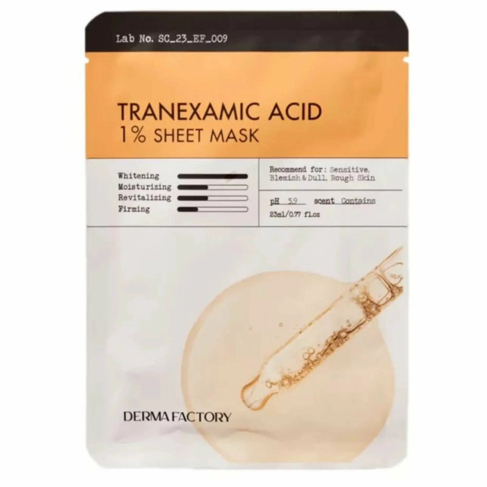 Выравнивающая тон кожи тканевая маска с транексамовой кислотой Derma Factory Tranexamic Acid 1% Sheet Mask мгновенно преображает и увлажняет эпидермис. Делает лицо гладким, убирает следы усталости и бессонницы, приятно освежает.